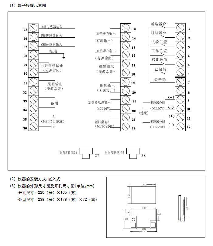 功能描述:動(dòng)態(tài)模擬顯示圖、語音防誤提示、柜內(nèi)溫濕度顯示及控制、高壓帶電顯示及閉鎖、人體接近語音提示、遠(yuǎn)方/就地操作、照明操作、分/合閘指示、儲(chǔ)能指示、分/合閘回路完好指示、預(yù)分預(yù)合閃光指示和RS-485 通訊接口。